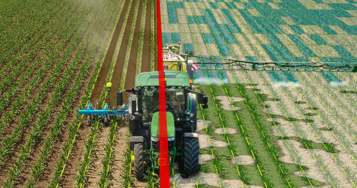 - John Deere, désherbage localisé avec See & Spray™ Universal par détection en temps réel des adventices, et guidage de l’outil de désherbage mécanique dans les rangs.