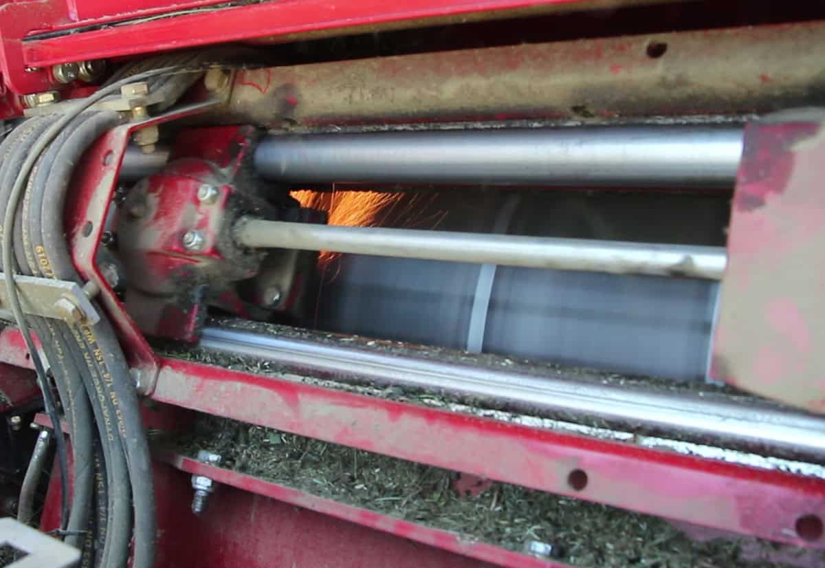 Parmi les changements importants par rapport aux anciennes ensileuses de la cuma, on trouve le détecteur de métaux. Indispensable aujourd’hui. Par ailleurs, avec ses 32 couteaux coupant de bas en haut pour faciliter l’éjection, la FCT 1260 offre une bonne qualité de hachage. Par contre, l’affûtage s’avère moins aisé que sur une automotrice. Il faut déplacer l’embout d’un cardan pour faire tourner le rotor à l’envers. D’autre part, une tôle demande à être démontée. La pierre prend place sur un guide coulissant. Le chauffeur lui imprime des allers et retours manuellement, tout en réglant l’appui sur les couteaux. «De temps en temps, je détalonne également les couteaux à la meuleuse. Nous tablons sur une durée de vie de 500ha».
