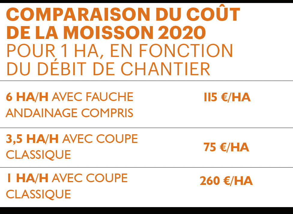 En plus des atouts techniques, la fauche andainage tire largement son épingle du jeu sur le plan économique aussi dans certaines situations. En effet, le coût moyen pour faucher et battre un hectare s’établit à 115€. Dans la mesure où la facturation pour la batteuse se base sur le nombre d’heures, là où elle aurait plafonné à 1ha/h avec sa coupe classique de 7,60m, le gain est appréciable.