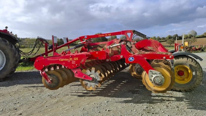 Les Väderstad Carrier 525 XL des cuma interrogées possèdent quasiment tous deux rangées de disques crénelés de diamètre 610 mm. Seule une cuma a des disques de 510 mm. Dans tous les cas, elles saluent la facilité de pénétration, même en sol sec. En cause, le poids de l’outil, plus de 7 tonnes avec les rouleaux des cuma, le rouleau sillonneur ou avec anneaux profilés en U. Nombreuses sont les cuma à l’employer presque toute l’année : déchaumage, faux-semis, préparation de lit de semences (souvent en deux passage croisés), destruction de prairie… « Attention, il faut travailler entre 10 et 12 km/h pour faire du bon boulot », entend-on souvent. Les cuma disent que, pour être à l’aise, il faut minimum 200 ch pour emmener le Carrier 525 XL. Retour sur l’avis utilisateur Väderstad Carrier 525 XL.