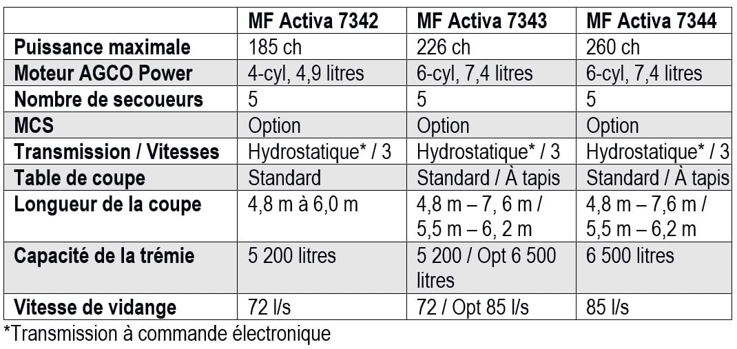 Par rapport à l’ancienne gamme, ces Activa bénéficient d’une nouvelle table de préparation avec des éléments amovibles résistants et faciles à nettoyer. Elles reçoivent également une transmission hydrostatique pourvue d’une commande électronique, plus précise. Enfin, la cabine a reçu une série d’améliorations: siège pneumatique, accoudoir solidaire du siège, commandes mieux disposées, éclairage.