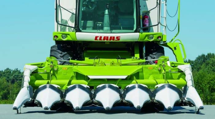 Les cueilleurs à maïs grain Claas s’appellent désormais Corio. Ils travaillent presque à plat (17° d’angle seulement). Leur pointe est très effilée pour retarder le contact avec les tiges. La transmission fait appel à deux renvois d’angle et un arbre d’entraînement. Les capots se relèvent entièrement à 90° pour l’entretien. Ils se replient en Z pour réduire l’encombrement sur route (80 cm en moins). Ils possèdent enfin deux parties interchangeables, dans les zones d’usure.