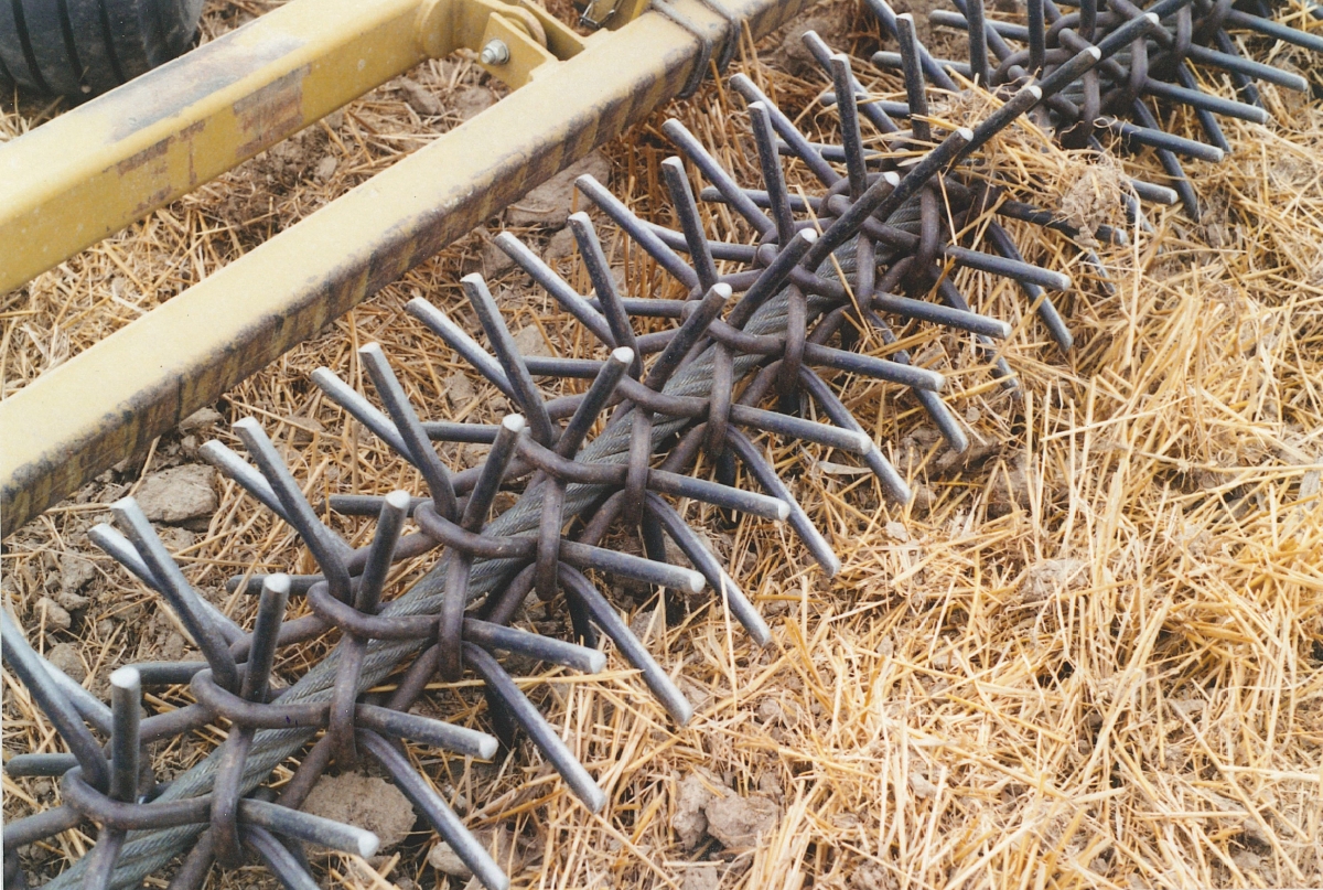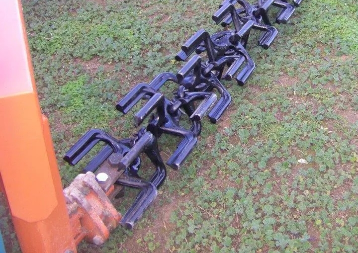 Un animal dans ma herse ! Après la queue de cochon, voici la patte de chien. Plus précisément la « dog leg harrow » du constructeur australien Bute Discs. Vu son aspect, on pourrait parler de herse à dents coudées. Mais au lieu d’être solidaires d’un châssis, ces dents appartiennent à des éléments attachés les uns aux autres en formant une chaîne. Sur le même principe que les herses à disques Kelly, Fliegl ou Dalbo.
