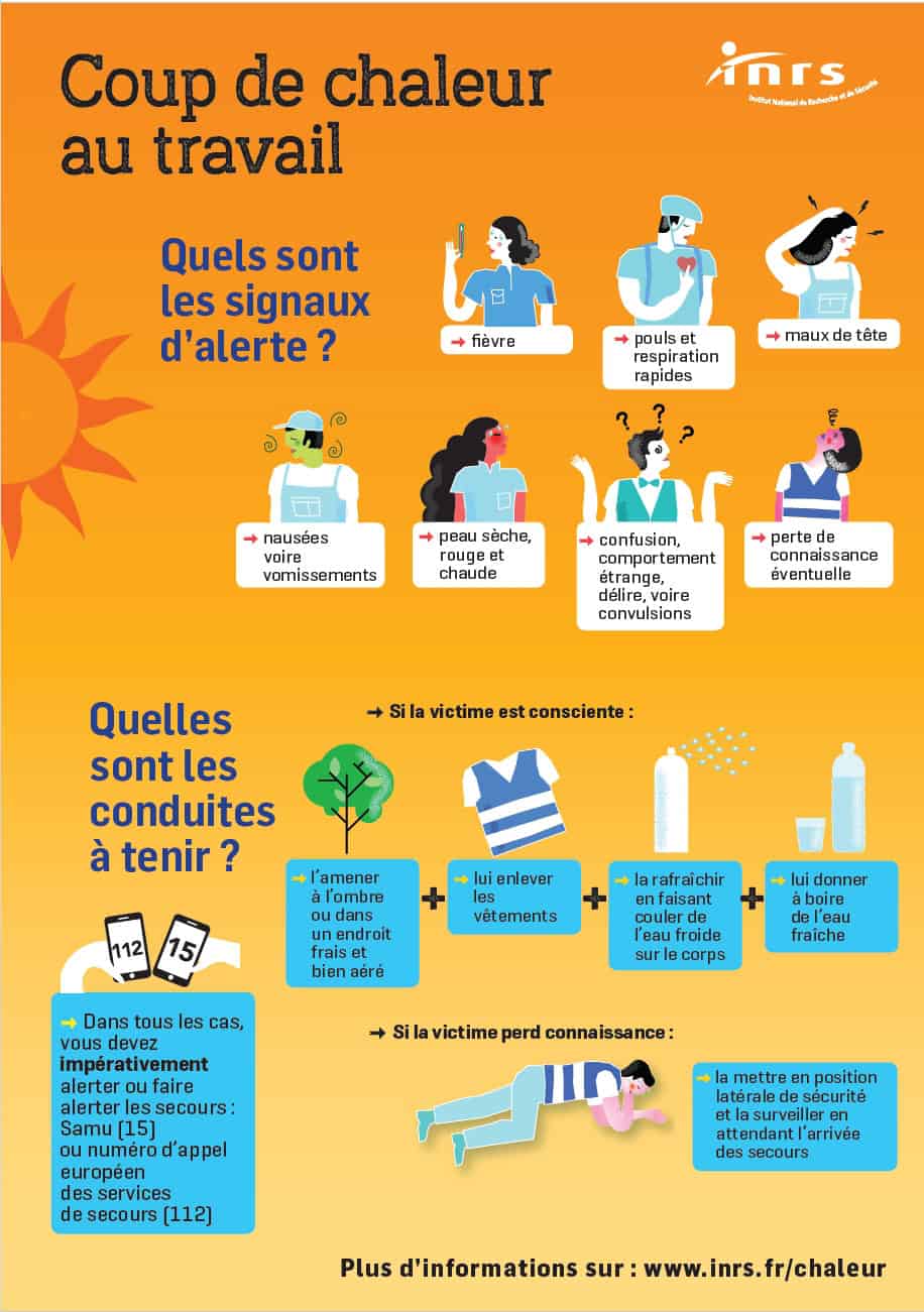 Plusieurs signaux d’alerte doivent laisser craindre un coup de chaleur. A savoir : fièvre, pouls et respiration rapides, maux de tête, nausées voire vomissements, peau sèche, rouge et chaude, confusion, comportement étrange, délire, voire convulsions, et éventuellement perte de connaissance. Dans ce cas, la MSA recommande deux mesures. D’une part appeler les secours (le 15 ou le 112). Et d’autre part prendre soin de la victime. Si elle est consciente : l’amener à l’ombre ou dans un lieu frais et aéré, lui enlever ses vêtements, la rafraîchir en lui faisant couler de l’eau froide sur le corps ((nuque et aisselles en priorité), et lui donner à boire de l’eau fraîche. Si la victime a perdu connaissance, il est nécessaire de la mettre en position latérale de sécurité (l’interlocuteur des secours dira comment au téléphone), et de la surveiller en attendant les secours.