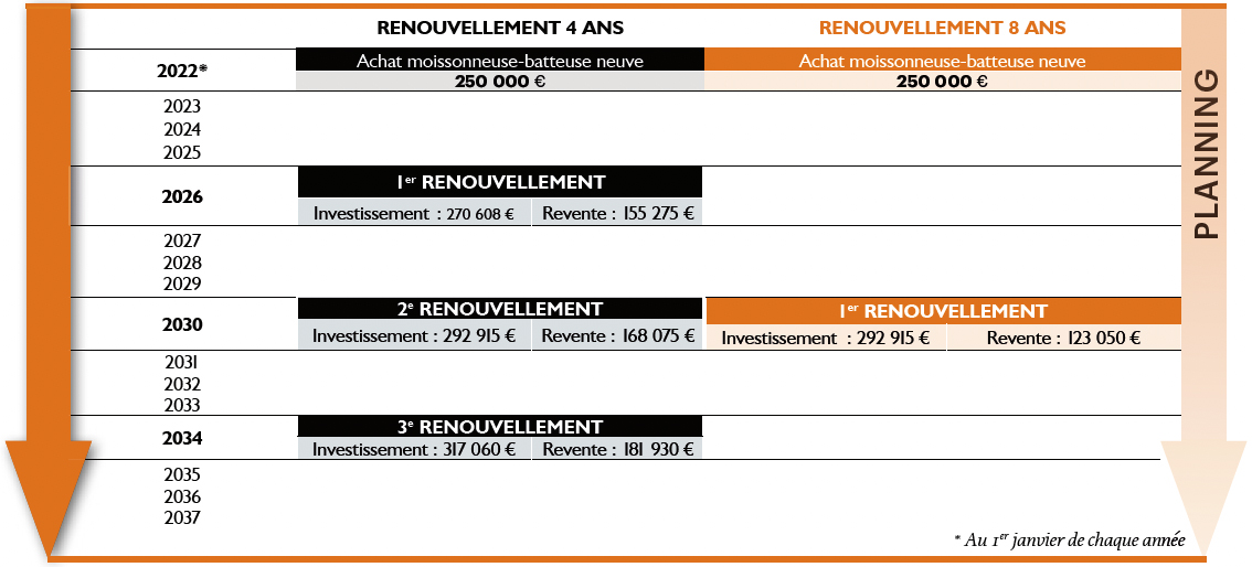 Ainsi, d’une part dans le cas d’un renouvellement sur 4 ans, nous avons comptabilisé trois renouvellements. Et d’autre part un seul dans le cas d’un renouvellement tous les 8 ans (voir le planning achats reventes).