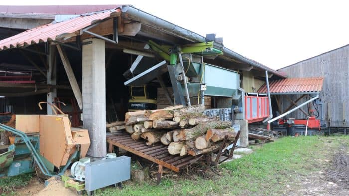 Bruno Neyroud est installé en gaec depuis 1992 avec deux autres associés. Comme activités, un élevage bovin lait pour l’IGP Saint-Marcellin, 15 hectares en AOP noix de Grenoble et aussi une activité bois avec laquelle tout va commencer. « Le bois est une partie importante des activités du gaec. Nous faisons des piquets pour l’élevage, du bois bûche et aussi du bois déchiqueté avec la cuma Bois énergie du Dauphiné dont je suis le président. »