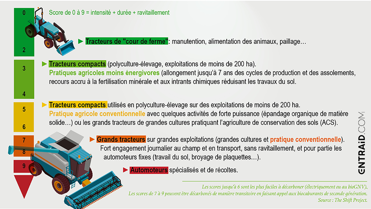 L’an dernier, The Shift Project a publié dans son étude sur l’agriculture bas-carbone un scoring de faisabilité technologique d’après les avancées techniques connues. Résultat : les automoteurs spécialisés de récolte sont les plus difficiles à décarboner. À l’inverse, les petits tracteurs de cour de ferme ont les premiers les capacités pour être les plus vertueux (voir infographie ci-dessus).