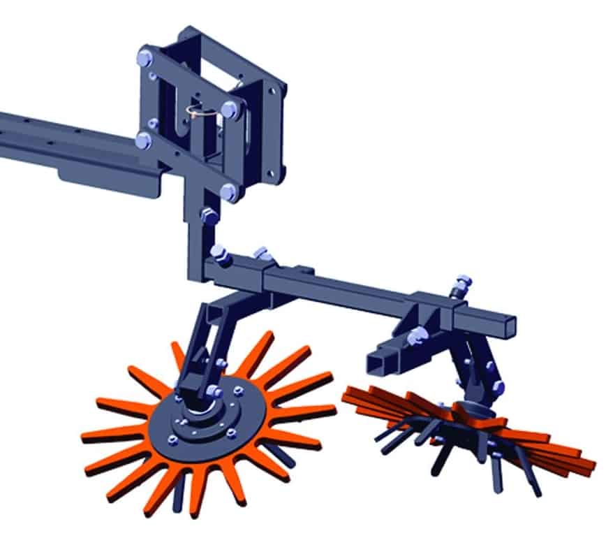 APV a développé un châssis de herse étrille qui permet de régler l’appui au sol de 0 à 7,5kg par dent et d’obtenir la même valeur quels que soient les mouvements verticaux sur 25cm de plage. La machine, Vario Strigel, est ainsi apte à herser des cultures buttées (un avantage déjà connu chez Treffler). Dents de 8mm, une tous les 35mm, bridées pour ne vibrer que dans le sens vertical. Autre nouveauté : la roto étrille réglable.