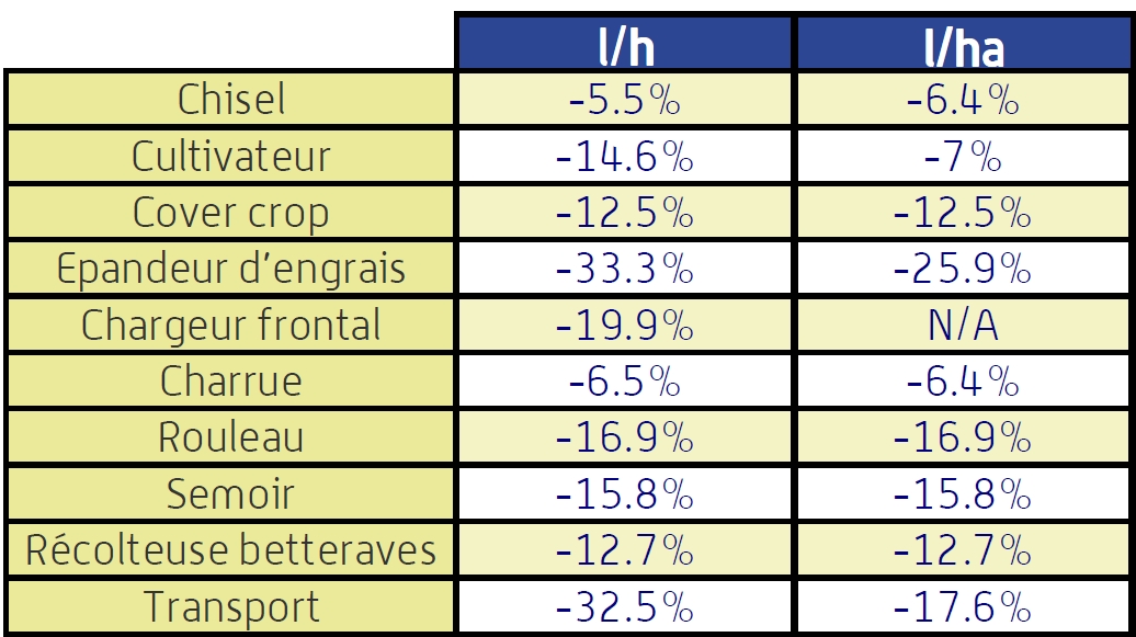 Pour illustrer l’effet du régime moteur sur l’économie de carburant, on peut rappeler les mesures réalisées il y a une dizaine d’années dans le cadre de l’opération européenne efficient20. Les agriculteurs testeurs étaient passés d’un régime habituel pour eux, 1800 à 2000 tr/min, à celui recommandé par les formateurs, soit 1600 à 1800 tr/min ou même moins en cas de travail léger. Bilan : entre 6 et 26% de GNR en moins à l’hectare. Cela vaut le coup d’y regarder !