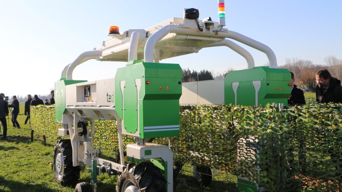 « Les robots sont désormais opérationnels sur le désherbage mécanique et le travail du sol en plein, la tonte, la pulvé, le semis de couverts et le traçage pour les plantiers. Des perspectives s’ouvrent pour les robots de taille, qui sont en test. Et de notre côté, nous testons avec un constructeur, en co-développement, un prototype pour la récolte de grappes entières », a-t-il précisé.