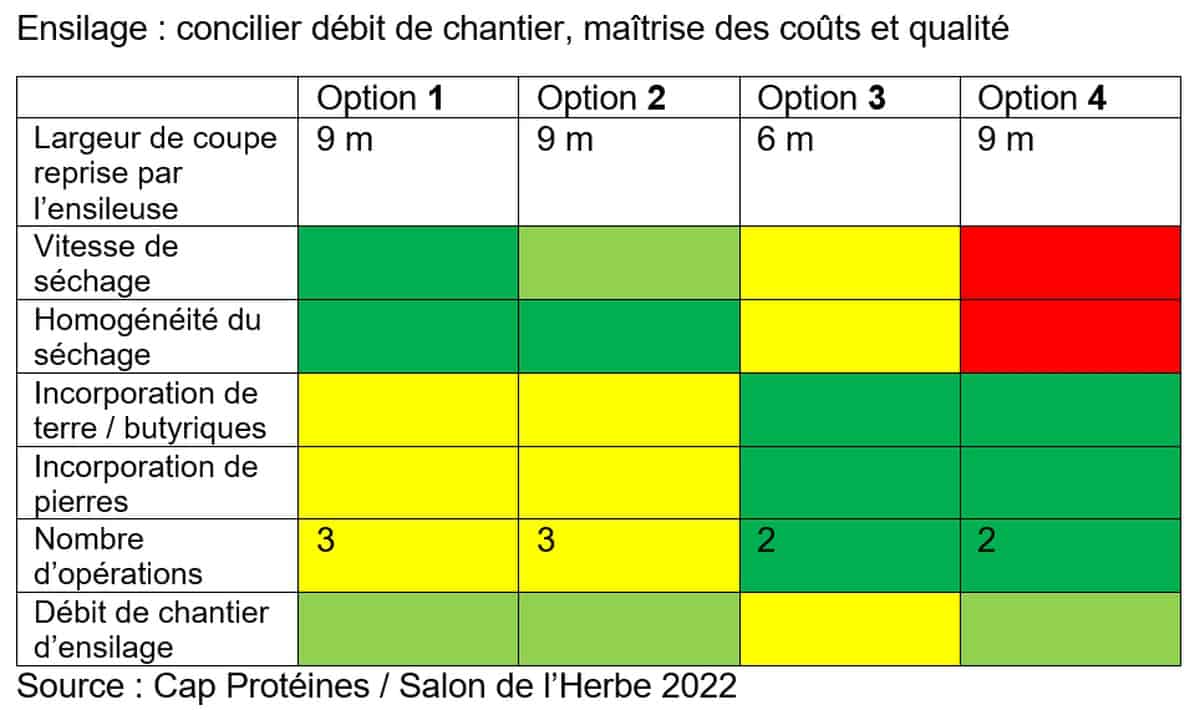 Le pôle conseils du Salon de l’Herbe 2022 présentait une intéressante analyse des itinéraires d’ensilage d’herbe. Des travaux issus du projet Cap protéines, et intitulés «Concilier débit de chantier, maitrise des coûts et qualité.» Dans tous les cas, l’ensilage est prévu 36 à 60h, voire 72h après la fauche. Option1: fauche à plat ou conditionnée avec éparpillement large puis regroupement de trois fois 3m de coupe. Soit trois passages au total. Son point fort: la vitesse et l’homogénéité du séchage.