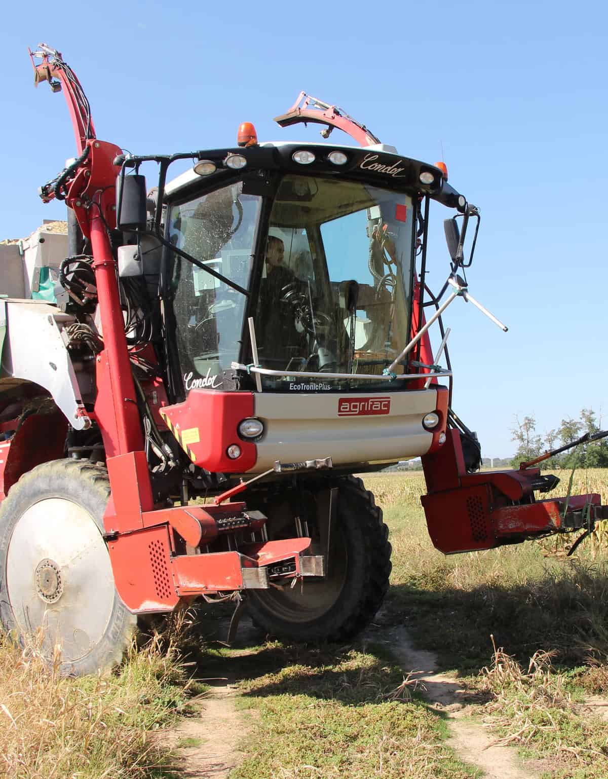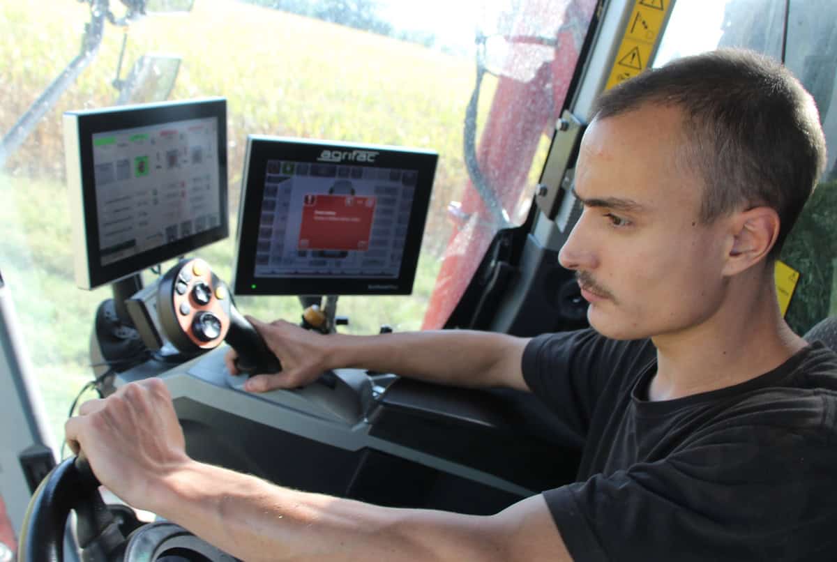 Jonathan Salasc assure la conduite de cette ensileuse hors normes. «Le porteur est très confortable, grâce au châssis articulé et à la suspension. La conduite demande de l’attention, elle est plus facile dans les maïs semés au RTK». D’autre part, les têtes d’ensilage possèdent un patin pour régler la hauteur. Heureusement car les rangs femelles entravent la visibilité. «De toutes façons l’essentiel est de récolter l’épi, je ne cherche pas forcément à descendre au ras du sol».