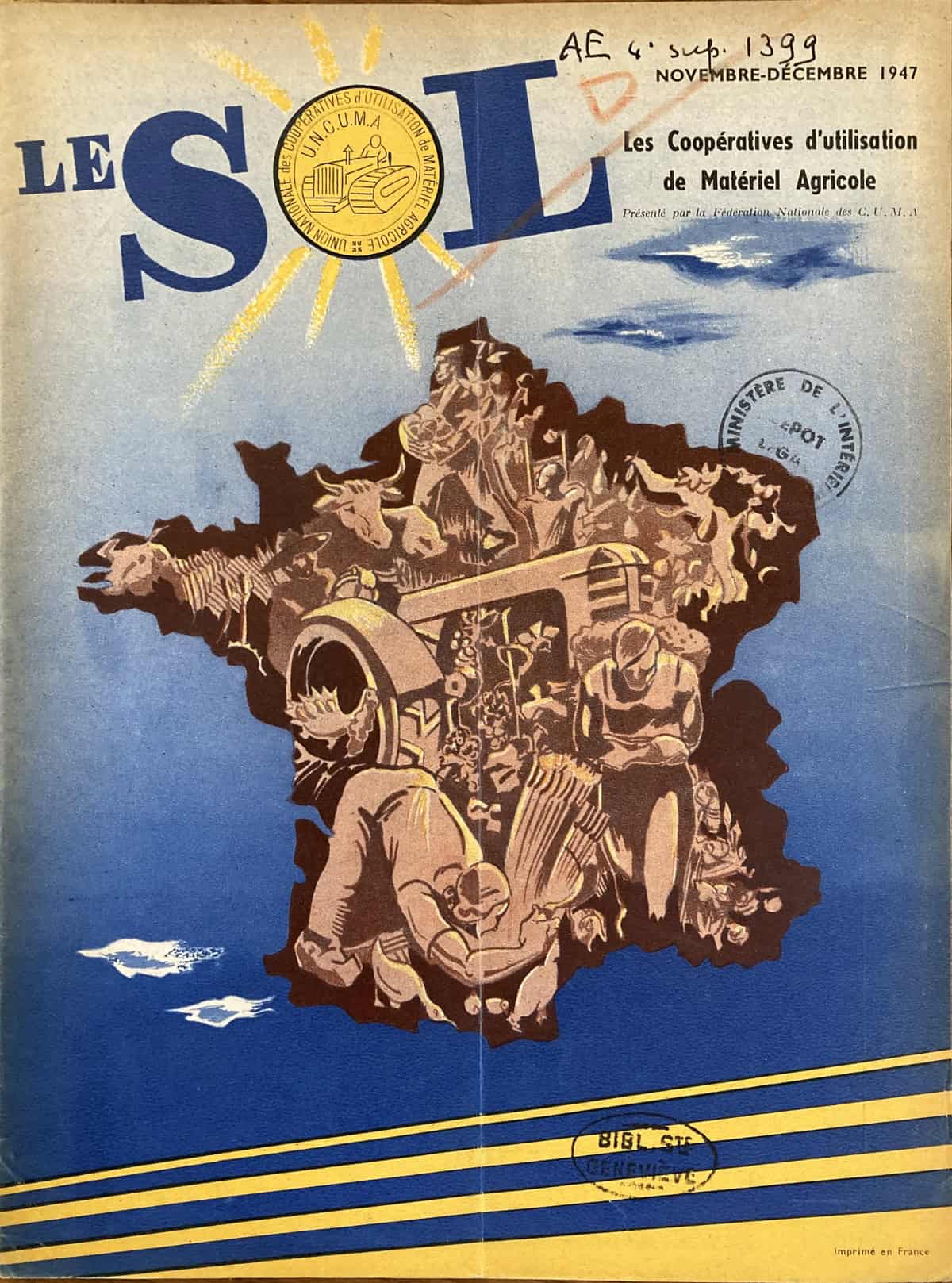 Il s’avère qu’un journal national consacré aux cuma a existé juste après-guerre, bien avant Entraid. En effet, la revue agricole généraliste Le Sol, créée à la fin 1945, affiche dans son édition de novembre-décembre 1947 ce sous-titre « Les coopératives d’utilisation de matériel agricole – Présenté par la Fédération Nationale des C.U.M.A. ». En 1948, ce sera «Organe de Liaison des Coopératives d’utilisation de Matériel Agricole». La une porte aussi le logo de l’Union nationale des cuma, une structure commerciale chargée à l’époque de procurer en direct des matériels et des fournitures aux cuma. On retrouve quelques autres numéros de ce journal Le Sol (ISSN 2025-5438) dans les archives, jusqu’en 1952. Puis plus rien.