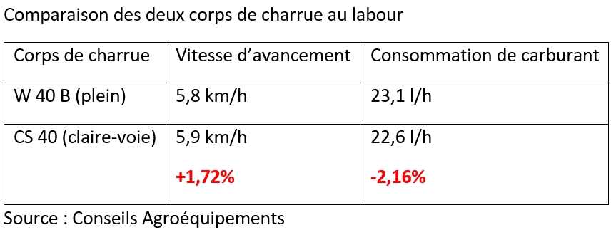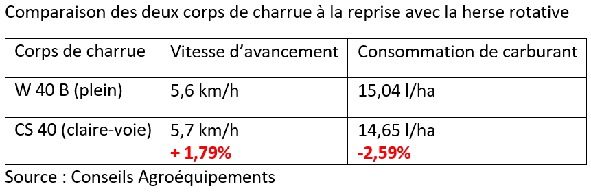 Le bénéfice ne se trouve donc pas dans la phase de labour, mais plutôt à la reprise. Suite à un labour avec une charrue à corps claire-voie, la herse rotative demande moins d’efforts pour obtenir un même niveau d’émiettement et consomme donc moins.