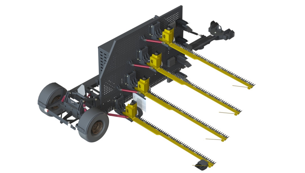D’autre part, c’est un groupe hydraulique indépendant entraîné lui-même par l’hydraulique du tracteur qui leur fournit l’énergie motrice. Enfin, l’essieu bénéficie d’un vérin pour maintenir l’horizontalité de la coupe, précise Bish Enterprises.