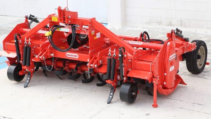 La fraise rotative Maschio-Gaspardo SC est disponible en versions PRO et BIO. Dans la première, de largeur 2,30 à 3,50 m, un nouveau système de refroidissement réduit de 10° la température du boîtier et l’huile, désormais synthétique, lubrifie mieux en usage intense. Quatre rotors sont proposés, en 54 ou 57 cm de diamètre.