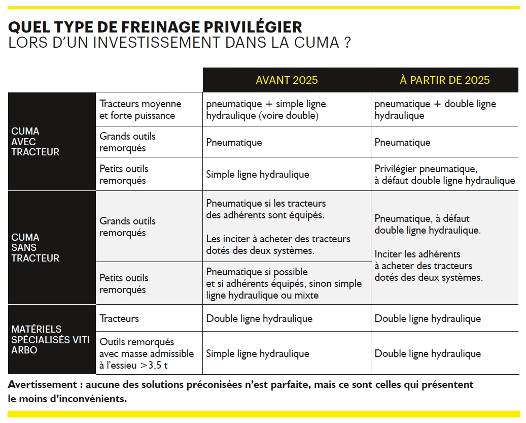 Pour les investissements en matériels tractés prévus par la cuma après le 1er janvier 2025, et au vu des tendances actuelles, continuer de privilégier le freinage pneumatique aussi bien pour les grands que pour les petits semble la bonne décision à prendre. Elle contribuera à converger vers une technologie harmonisée à moyen terme.