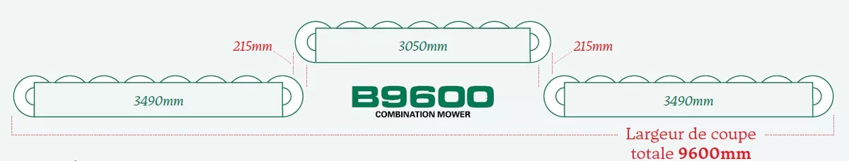 Le groupe de fauche McHale Pro Glide B9600 comprend deux unités de 3,49 m de largeur de coupe. Associé à une faucheuse frontale de 3,05 m, il peut récolter sur une largeur comprise entre 9,10 et 9,60 m selon le recroisement choisi.
