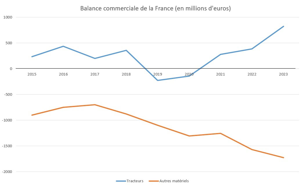 En entrant plus dans le détail, il apparaît que la branche tracteurs réussit nettement mieux que le reste. En effet, la balance commerciale devient cette fois globalement positive. Elle a même dépassé les 800 millions d’euros en 2023. Le rapport ne le précise pas mais on doit cette performance aux usines principales de deux grands acteurs : Claas (Le Mans), et AGCO (Beauvais), auxquels il faut ajouter une unité de Kubota (Bierne).