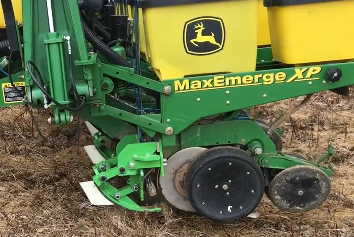 Susterre a développé un châssis portant la réserve de liquide et la pompe. Le tout embarque un semoir monograine John Deere. Le besoin supplémentaire en puissance s’avère toutefois élevé, de l’ordre de 12 ch par rang. Dans ces conditions, le jeu en vaut-il la chandelle ?