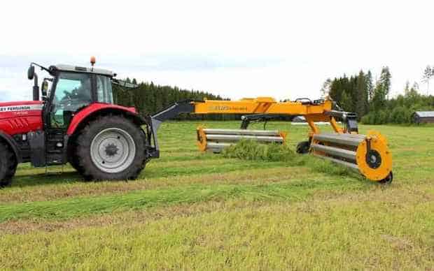 Agreom devrait présenter un andaineur à tapis Kuhn Merge Maxx 950, peut-être en association avec une ensileuse John Deere 8300 (avec pick-up d’origine), pour montrer la cohérence de l’ensemble. Le MM 950 comprend un pick-up avec rouleau tasse-andain et pare-vent, associé à un tapis. Il ramasse sur 9,50m maxi (selon la configuration choisie) et peut au choix former un andain central, de largeur réglable (2,20m maxi), un andain latéral (1, à 1,50m) en vue de regrouper sur l’aller et retour, ou encore un andain central et un latéral simultanément (très gros volumes de fourrage). L’andain régulier et homogène formé par cet andaineur permet d’éviter les à-coups lors de la récolte (presse ou ensileuse) et peut faire gagner jusqu’à 2 à 3km/h en vitesse de travail.