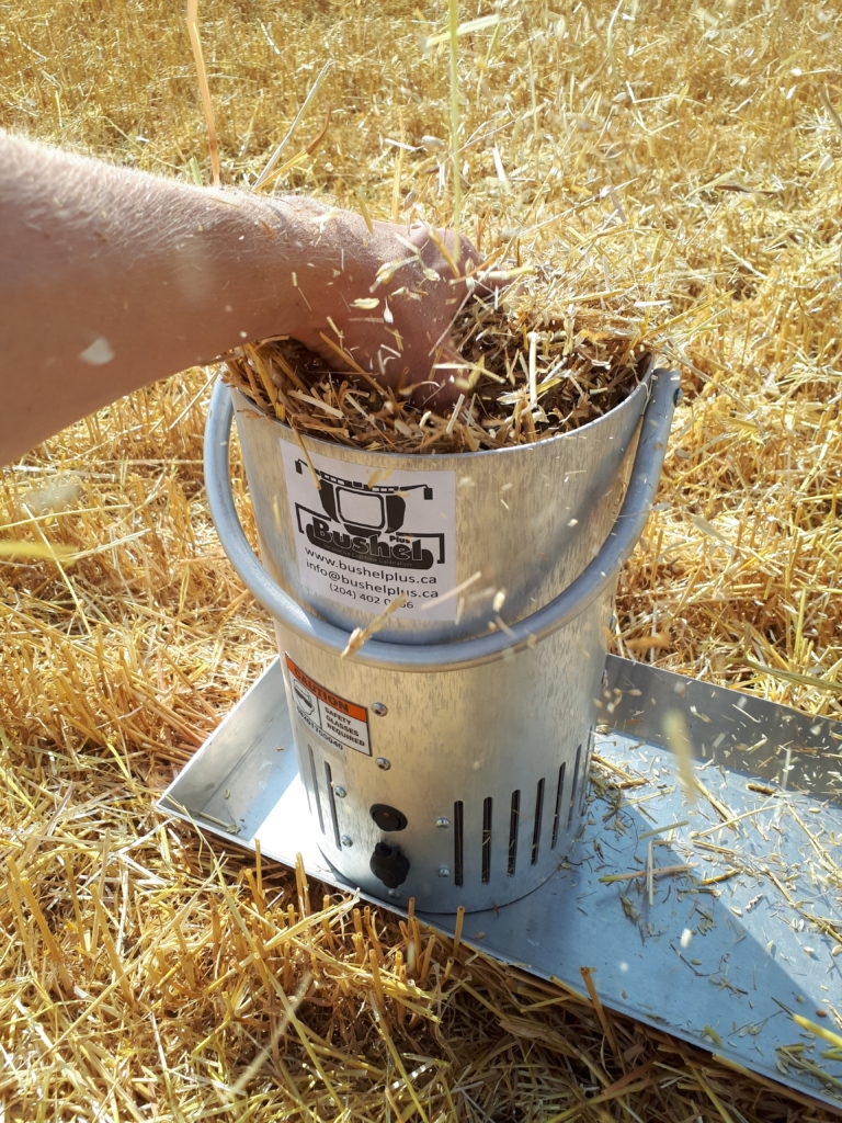 Dans un second temps, il utilise l’autre élément essentiel du kit. Il s’agit d’un tambour avec soufflerie électrique chargé de trier les grains de la paille. Une simple balance, également fournie, permet enfin de peser cette récolte. Une application traduit cette mesure en taux de perte.