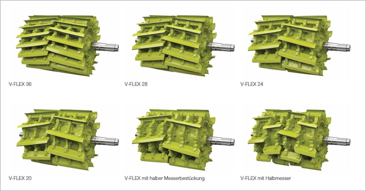 Ce rotor V-Flex reçoit au choix 20, 24, 28 ou 36 couteaux, pouvant se réduire à un sur deux ou un sur trois selon le modèle. De plus, il existe même une version avec demi couteaux, soit quatre en décalé sur la largeur au lieu de deux. Au total, les longueurs de coupe s’étendent de 3,5 à 53 mm.