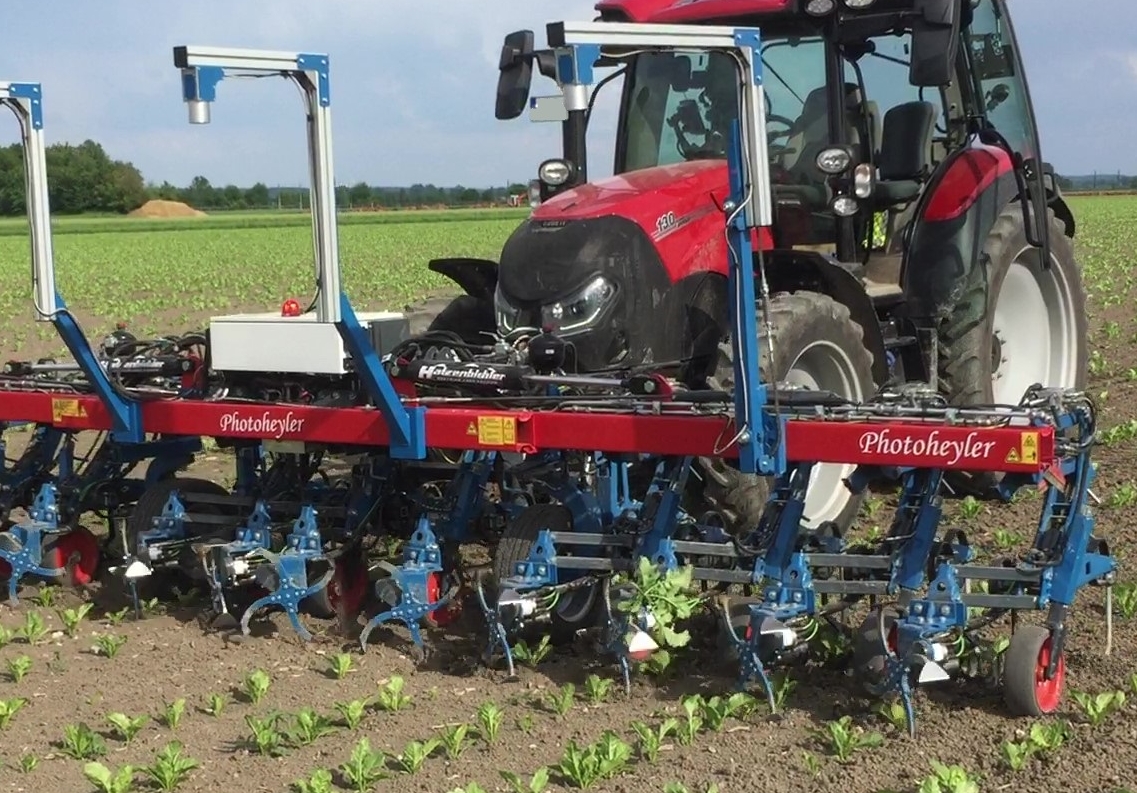 La bineuse Photoheyler (médaille d’argent 2022) intervient entre les plants le long du rang de culture. Elle comporte pour cela un rotor doté de quatre petites lames. Sa vitesse de rotation est coordonnée avec l’avancement pour donner un coup de lame pile entre deux plants. Par ailleurs, ce rotor complète le travail d’un jeu de socs classiques travaillant entre les rangs.