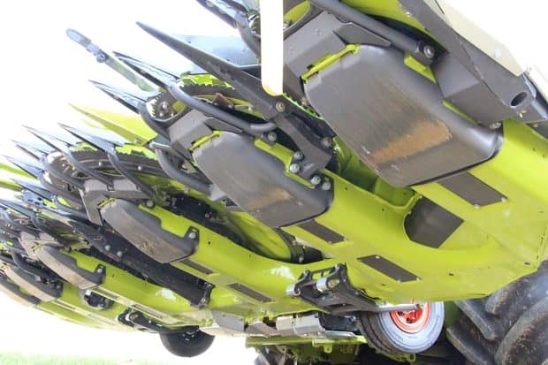 Le bec coupe très près du sol et présente un profil plus plat. Monté sur cadre oscillant, il suit les dénivelés. Le nouvel ensemble ‘scies, sections et débourreurs’ permet d’affronter les céréales immatures, méteils et autres cultures complémentaires au maïs. Autres éléments favorables à un meilleur flux : le cueilleur dispose de deux vitesses de travail, tandis que les « sapins de Noël », ameneurs verticaux placés à l’entrée du canal, ont trois régimes possibles.