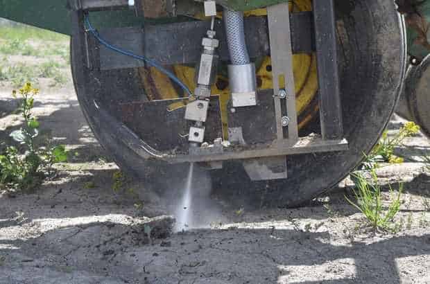 Le jet d’eau doit sa capacité à sa très haute pression: environ 4.000bars, soit deux fois plus que sur un injecteur dans un moteur diesel. L’eau pénètre de 5 à 10cm, laissant largement de marge dans le choix de la profondeur de dépôt de la semence. Un sabot particulier a été construit pour cela: il comprime la masse végétale devant être coupée et contrôle la profondeur. La consommation d’eau est, quant à elle, modeste: environ 76l/ha pour du maïs à 75cm, à 10km/h. Les questions d’encombrement de la réserve ne seraient donc pas un handicap.