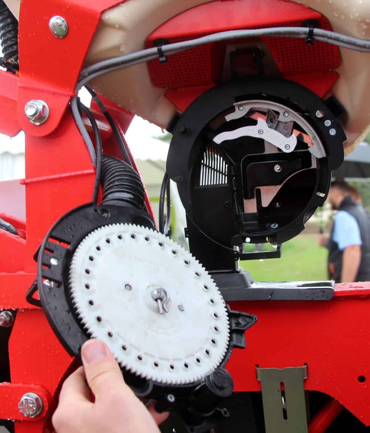 Au cœur de l’appareil prend place une distribution pneumatique à entraînement électrique Precision Planting, avec sélecteur automatique et éjecteur de grains sur le disque perforé. Les éléments semeurs reçoivent des chasse-débris rotatifs, une mise en terre à doubles disques et une roulette de rappui à bandage inox. Ils conviennent au semis direct. Le châssis offre pour sa part la possibilité de régler l’écart entre rangs, de 5 en 5 cm.