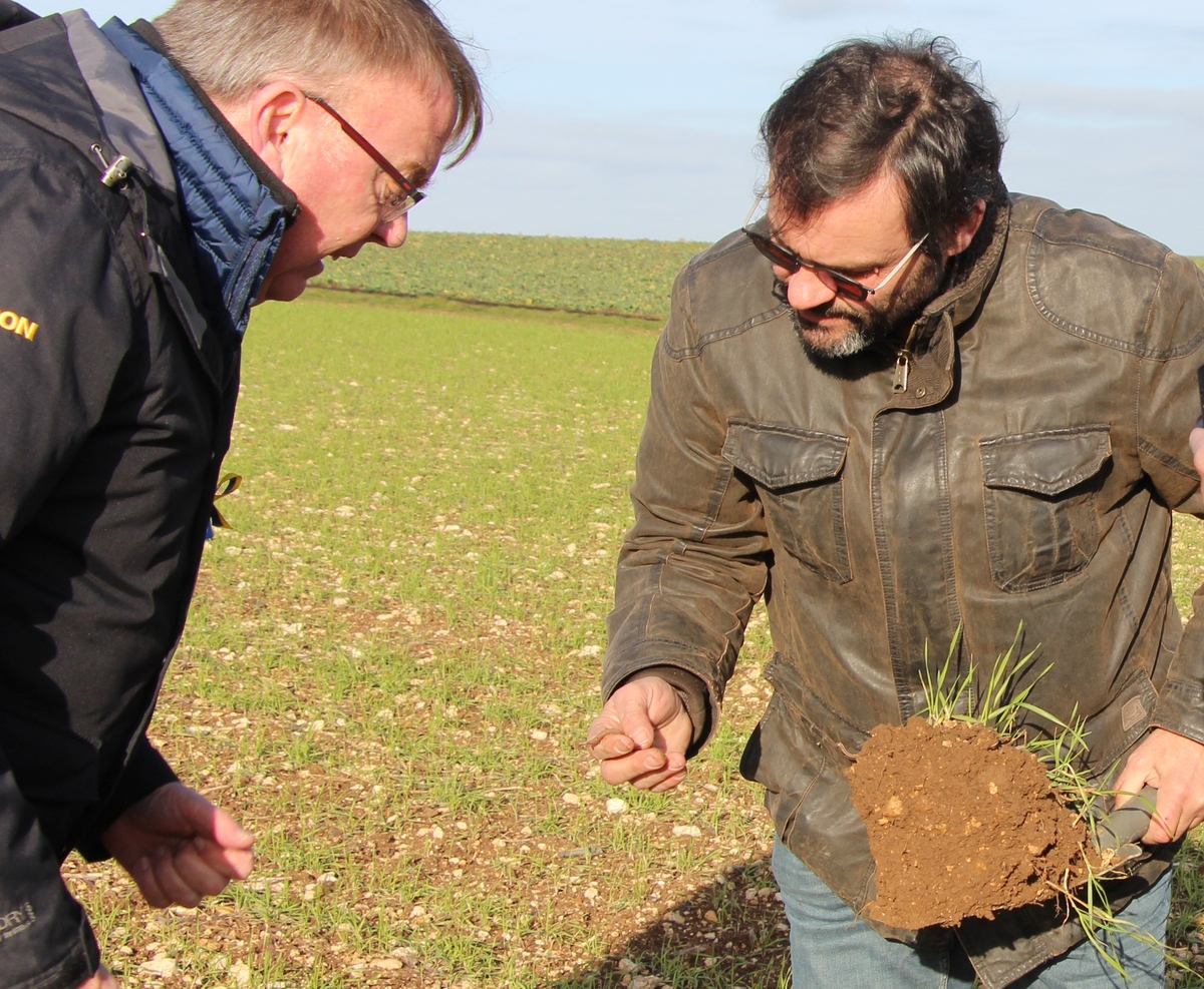 Damien Lidon, agriculteur du Loir-et-Cher (à d.), examine le profil du sol avec Simon Revell, responsable export de Claydon (à g.).