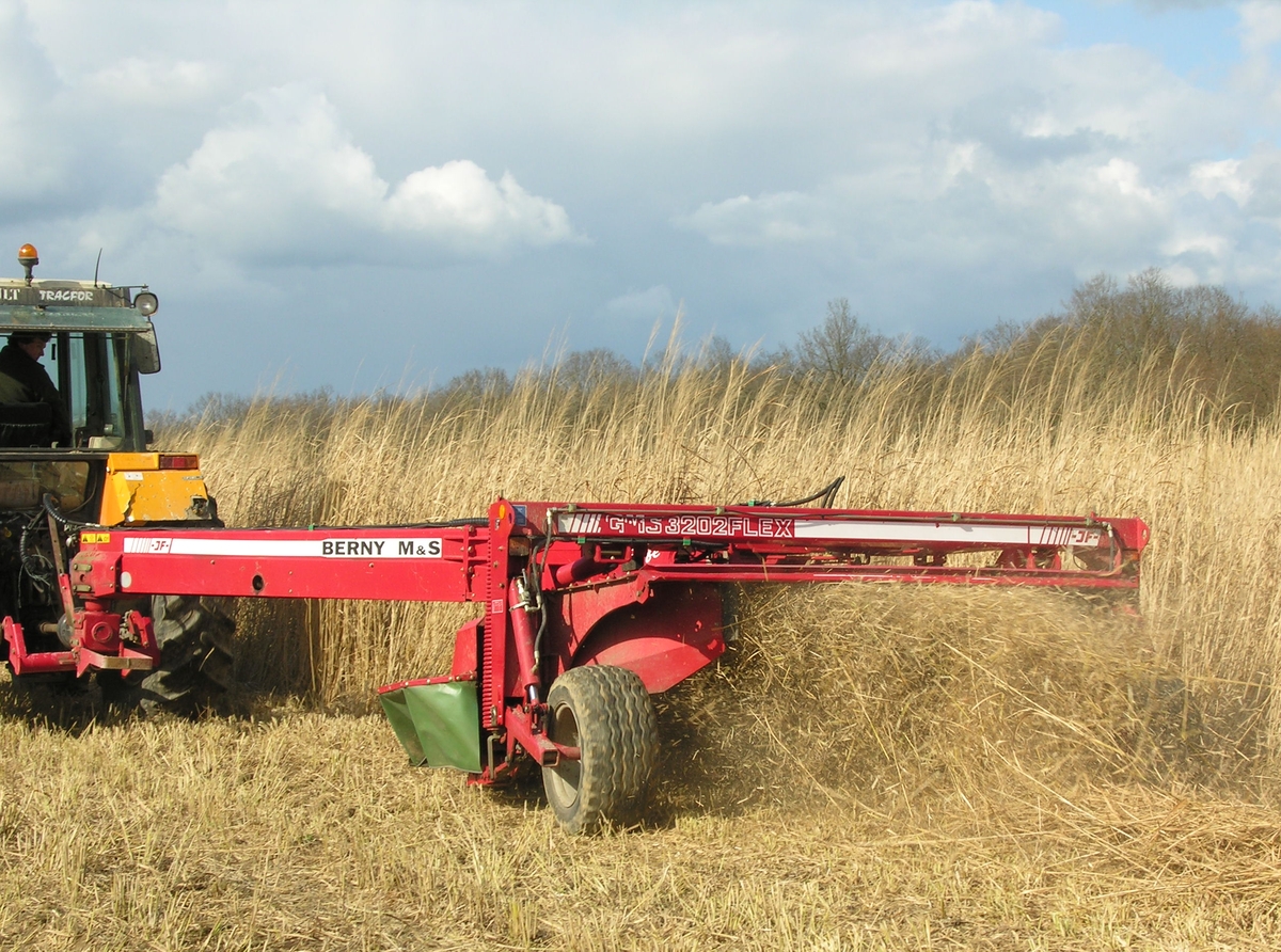 La première vraie récolte intervient après deux ans de pousse. En fin d’hiver, on peut espérer que le sol sera suffisamment ressuyé, sachant que le matelas racinaire aide bien. À ce moment, la paille est bien sèche. D’autre part, la reprise de la végétation de la culture ne va pas tarder, évitant ainsi que les adventices en profitent. Bien que le switchgrass puisse atteindre 2,50 m de haut, il se fauche facilement car il est sec et assez cassant.