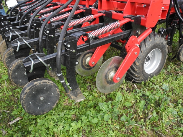 • Le semoir à dents Techmagri T-Sem Contour possède des éléments indépendants (tous les 23 cm), avec un disque ouvreur et une pointe en T inversé (Aitchison). Il peut travailler en direct.