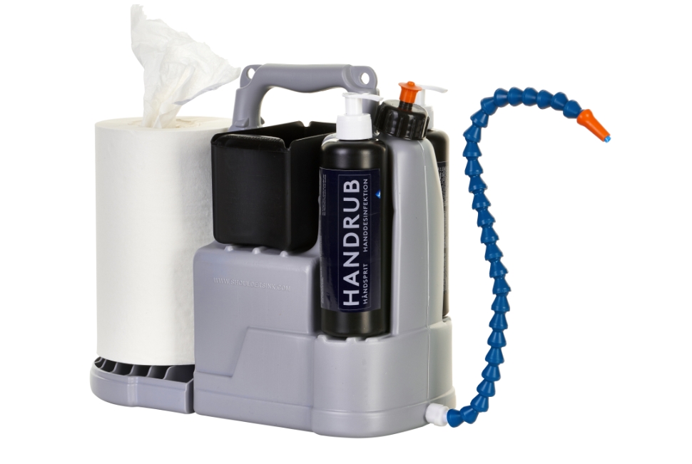 Le kit ShoulderSink permet de se laver les mains n’importe où. Conçu au Danemark pour les véhicules utilitaires, il peut aussi intéresser le monde agricole. Cet équipement portatif comprend d‘une part un réservoir d’eau. Pas de robinet, mais un simple tuyau flexible qu’on abaisse avec le coude pour faire sortir d’eau. Ensuite, deux emplacements servent à loger deux flacons de savon liquide ou autre produit similaire.