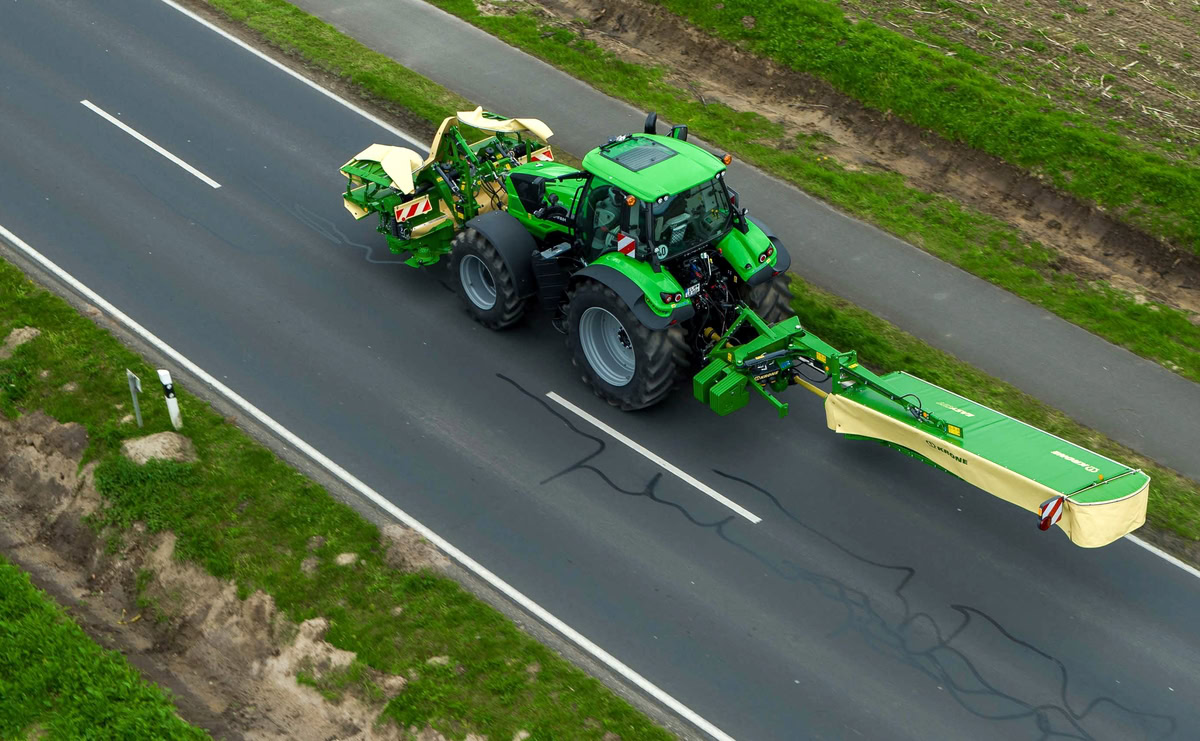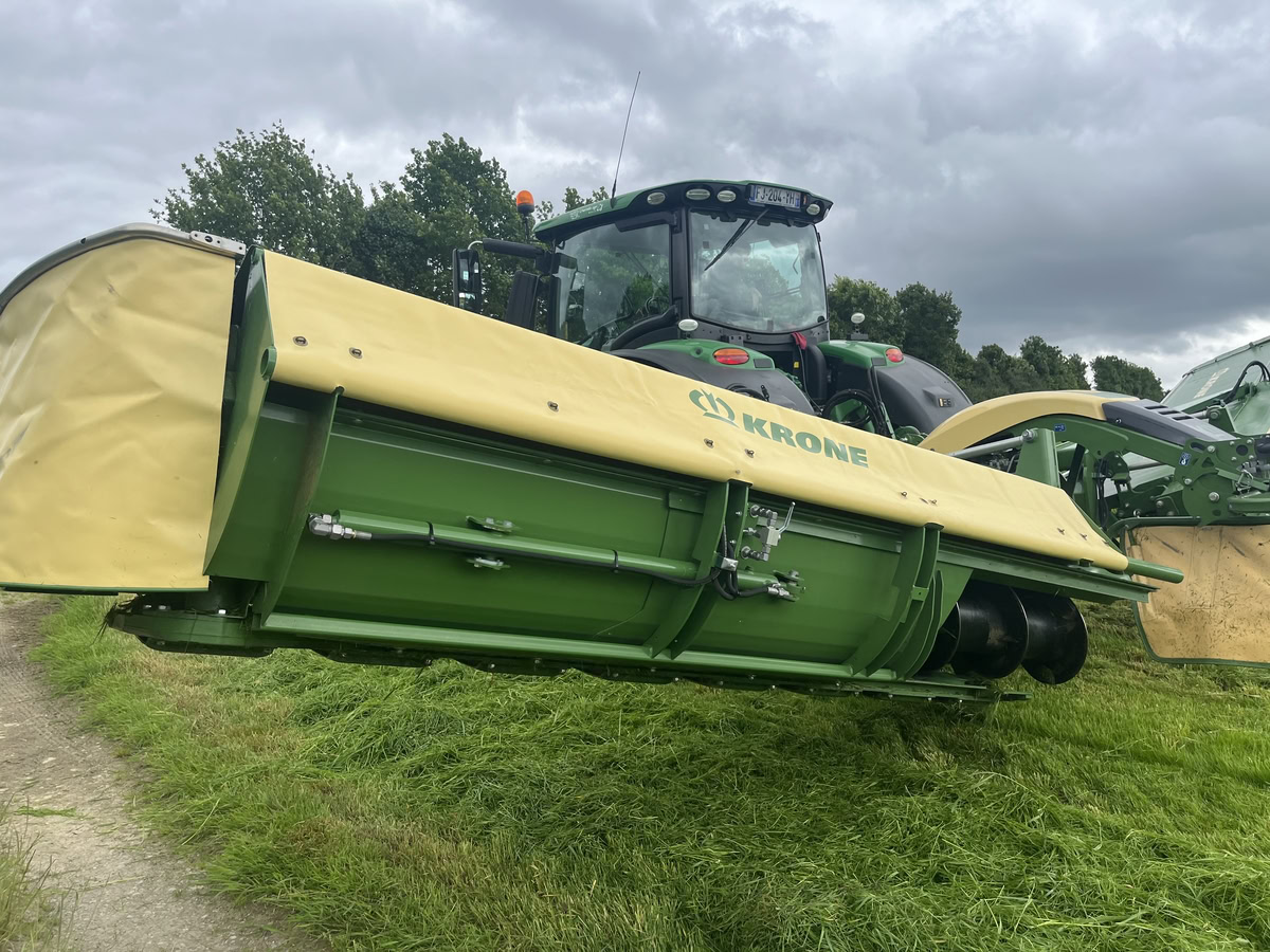 Cette faucheuse portée bénéficie d’une suspension hydropneumatique réglable en cabine, sans besoin d’un load-sensing. Un montage sur rotules améliore le suivi du sol. Sur route, la machine est portée à plat, pivotée vers l’arrière. Poids : 1250 kg, lamier Krone à 8 assiettes, entraînement sans courroies. Enfin, le constructeur cible l’utilisation en combiné, avec des machines entre 2,80 et 4 m à l’avant.