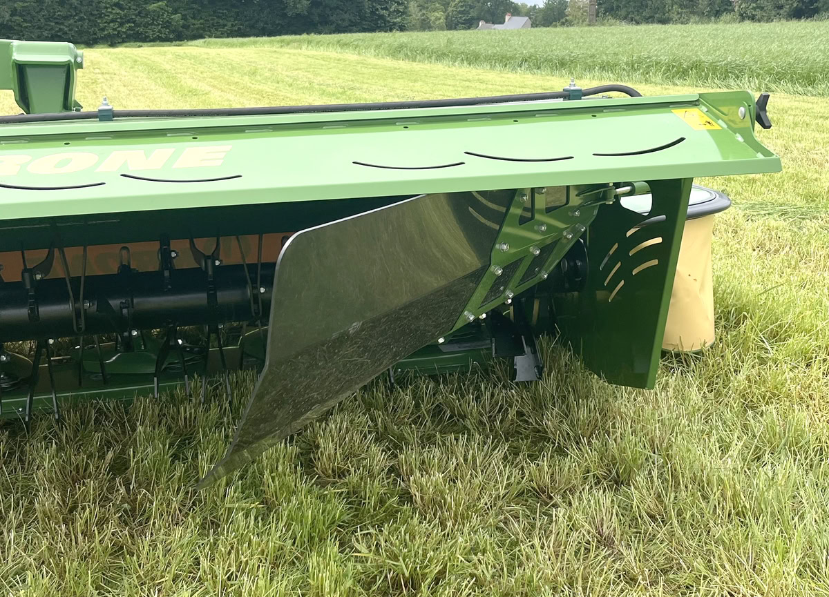 Krone lance une faucheuse portée de 4,50 m avec contre poids télescopique. Ainsi, le relevage est moins sollicité au travail et dans les manœuvres. Le facteur limitant n’est plus le poids du tracteur mais sa puissance. Un modèle à partir de 100 ch peut suffire, selon Krone. Le support mobile de cette EasyCut R 450 accueille jusqu’à 500 kg de masse. Il se déplace latéralement sur 60 cm de distance de façon automatique, en fonction de la position du lamier.
