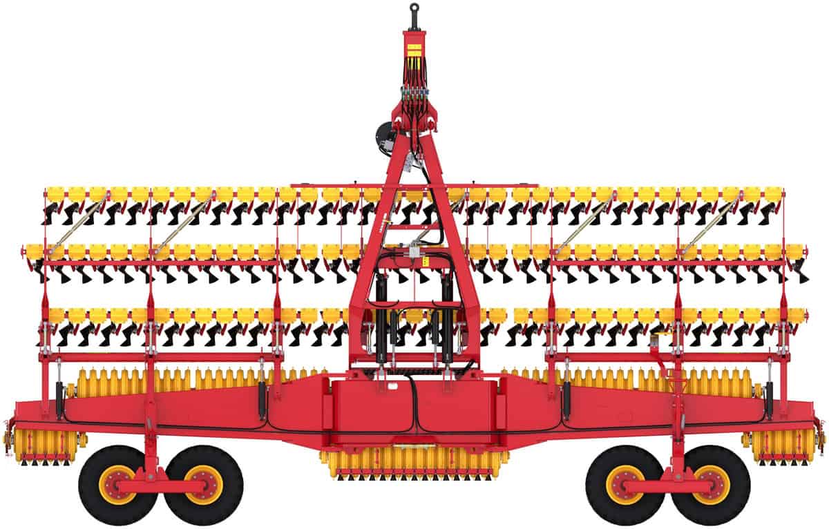 Cette configuration sera disponible fin 2024 sur un modèle 925 du Väderstad Carrier, en attendant d’autres versions. Soit 9,25 m de largeur de travail. Elle reçoit des disques de type CrossCutter, de 45 cm de diamètre. Dotés d’un profil fortement ondulé, ils équipent habituellement la rangée supplémentaire optionnelle, installée à l’avant du Carrier de base.